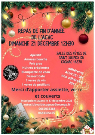 | Médiathèque Municipale : Le 10/12 à 16h30 L’arbre à contes (jusqu'à 5 ans) à la médiathèque du bourg de Cherves « Noël n'est pas loin » Gratuit Médiathèque Municipale : Le 12/12 à 18h30 Soirée Pyjama (durée 45 minutes) à la médiathèque de Cherves-Richemont Gratuit sur réservation Vivre en Borderies : Le 13/12 à 17h Concert de Noël par le Chœur Hospitalier à l'église du bourg de St Sulpice Entrée 10€ Détails Auto Club Val de Cognac : Le 21/12 à 12h30 Repas de fin d'année à la salle des fêtes du bourg de St Sulpice Détails Médiathèque Municipale : Le 23/12 Atelier créatif sur le thème «Spécial Noël sur réservations au 05 45 83 70 40 Gratuit à la médiathèque de Cherves-Richemont Détails |