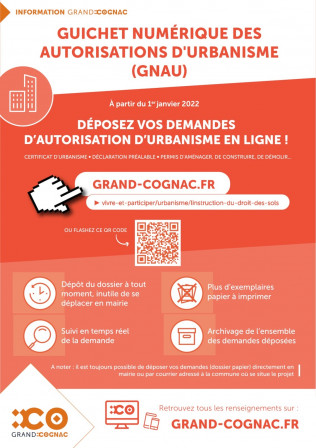 Depuis le 1er janvier 2022, les communes de la communauté d'agglomération de Grand Cognac peuvent recevoir des demandes d’autorisation d’urbanisme par voie électronique. Un outil de téléprocédure spécifique est à votre disposition afin de déposer vos demandes l sous forme dématérialisée et de suivre leur instruction.Vous pouvez accéder à ce service grâce aux liens suivants : https://www.grand-cognac.fr/ https://www.grand-cognac.fr/vivre-et-participer/urbanisme/linstruction-du-droit-des-sols |